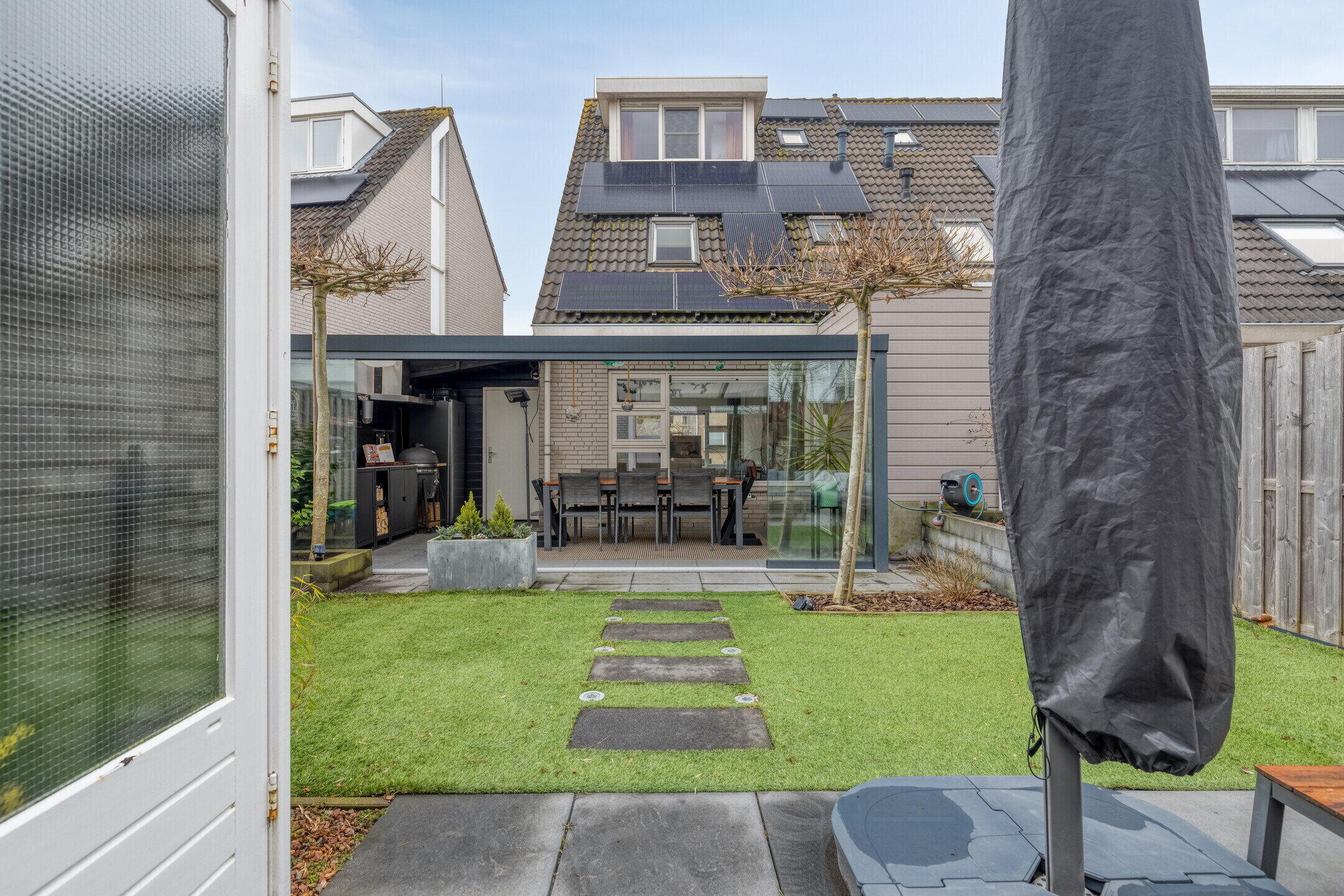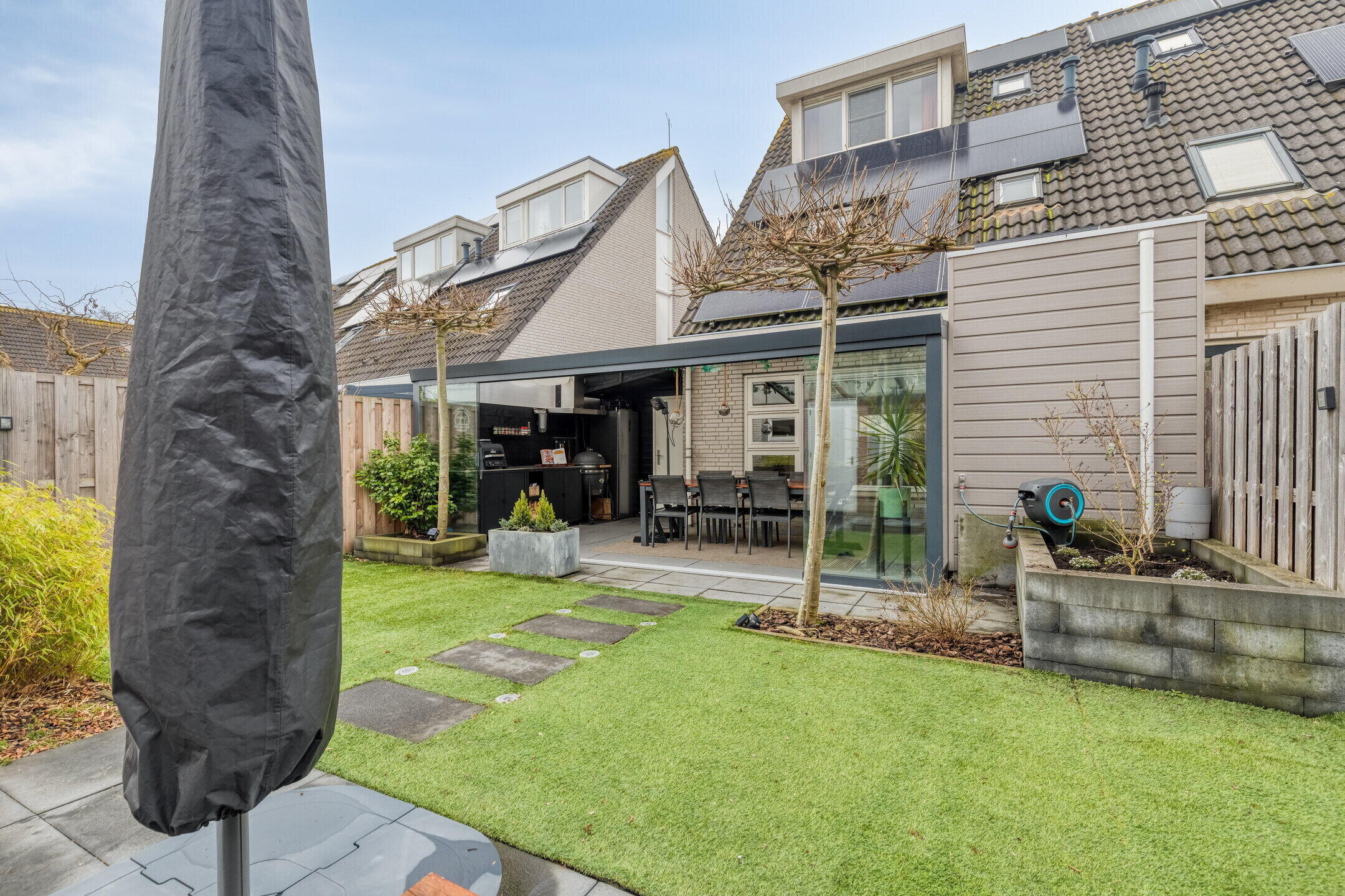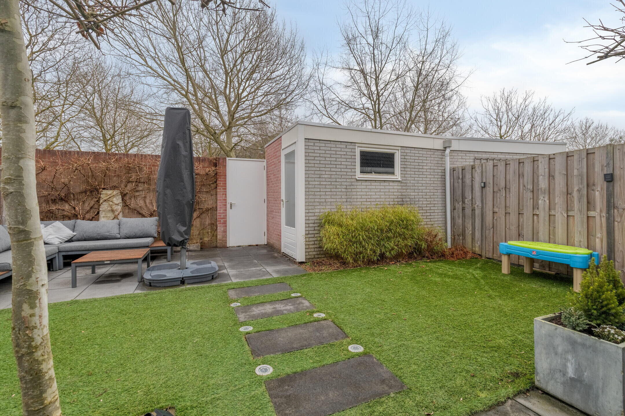 De ruime achtertuin is gelegen op het oosten en biedt u de mogelijkheid om heerlijk buiten te zitten bij het ochtendzonnetje. Ook is er een houten berging naast de woning, die extra opbergruimte biedt en direct toegankelijk is vanuit de serre. Tevens is de berging voorzien van een extra brede toegangsdeur (ideaal voor eventueel een motor/ bakfiets).